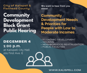 The purpose of this hearing is to obtain the views of community residents, especially low/moderate income residents, regarding community development needs and priorities of the City of Kalispell and Flathead County for economic development, housing and neighborhood revitalization and public facilities to inform the application. The CDBG program is administered by the State of Montana Department of Commerce and will make available to eligible local governments funding for housing, economic development, public facilities, public infrastructure, and planning activities, with the principal purpose of benefitting low/moderate income persons. The hearing will provide further information about the CDBG program and will allow for citizen participation in the development of any proposed grant applications.
