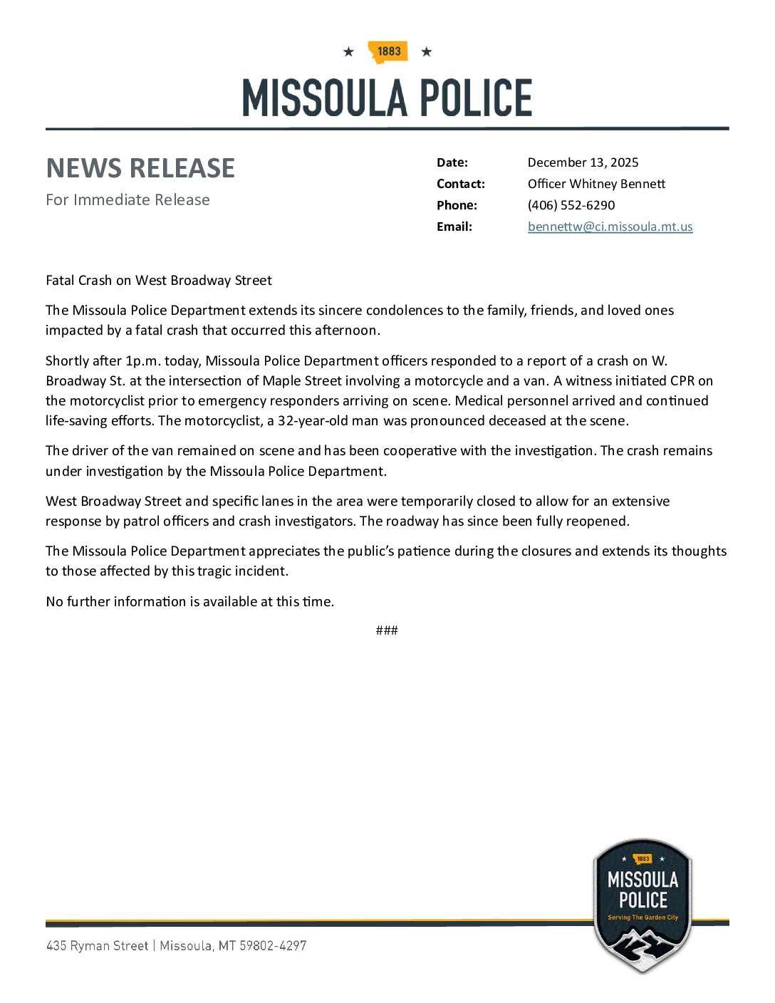 Shortly after 1p.m. today, Missoula Police Department officers responded to a report of a crash on W. Broadway St. at the intersection of Maple Street involving a motorcycle and a van. A witness initiated CPR on the motorcyclist prior to emergency responders arriving on scene. Medical personnel arrived and continued life-saving efforts. The motorcyclist, a 32-year-old man was pronounced deceased at the scene.