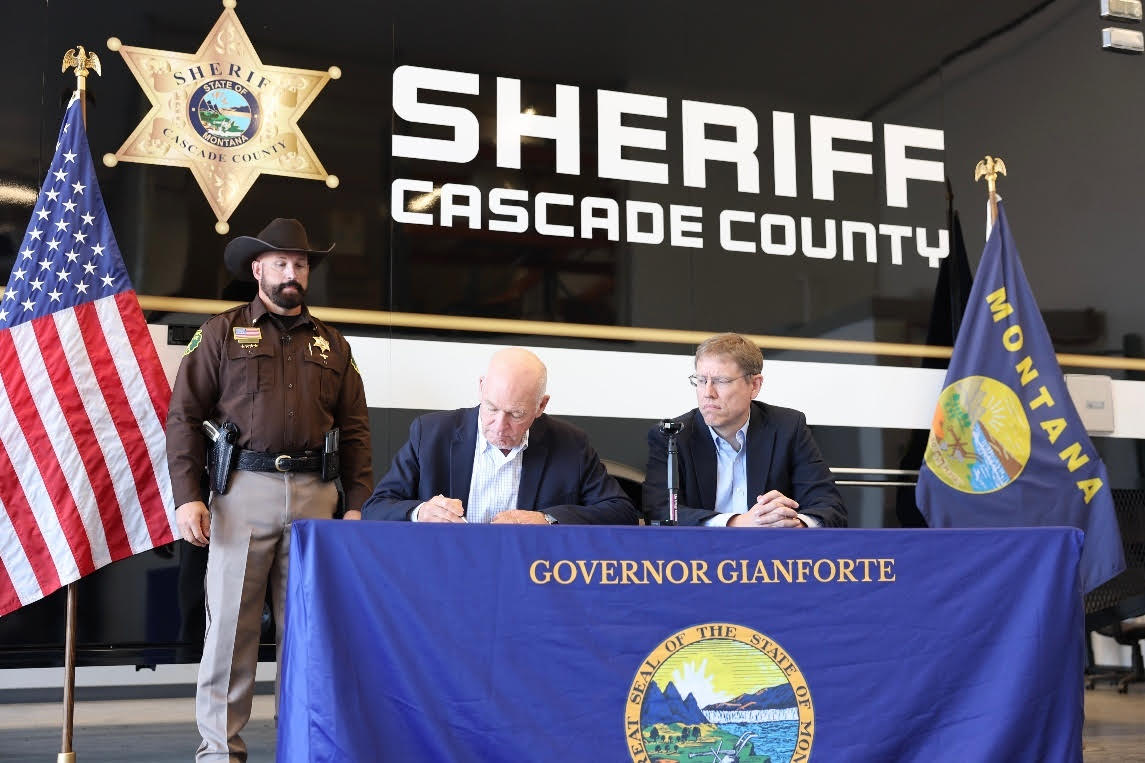 Cascade County: Joined Sheriff Jessie Slaughter and Rep. Steve Fitzpatrick, R-Great Falls, to spotlight House Bill 323 which increased resources to counties to hire deputies, Great Falls.