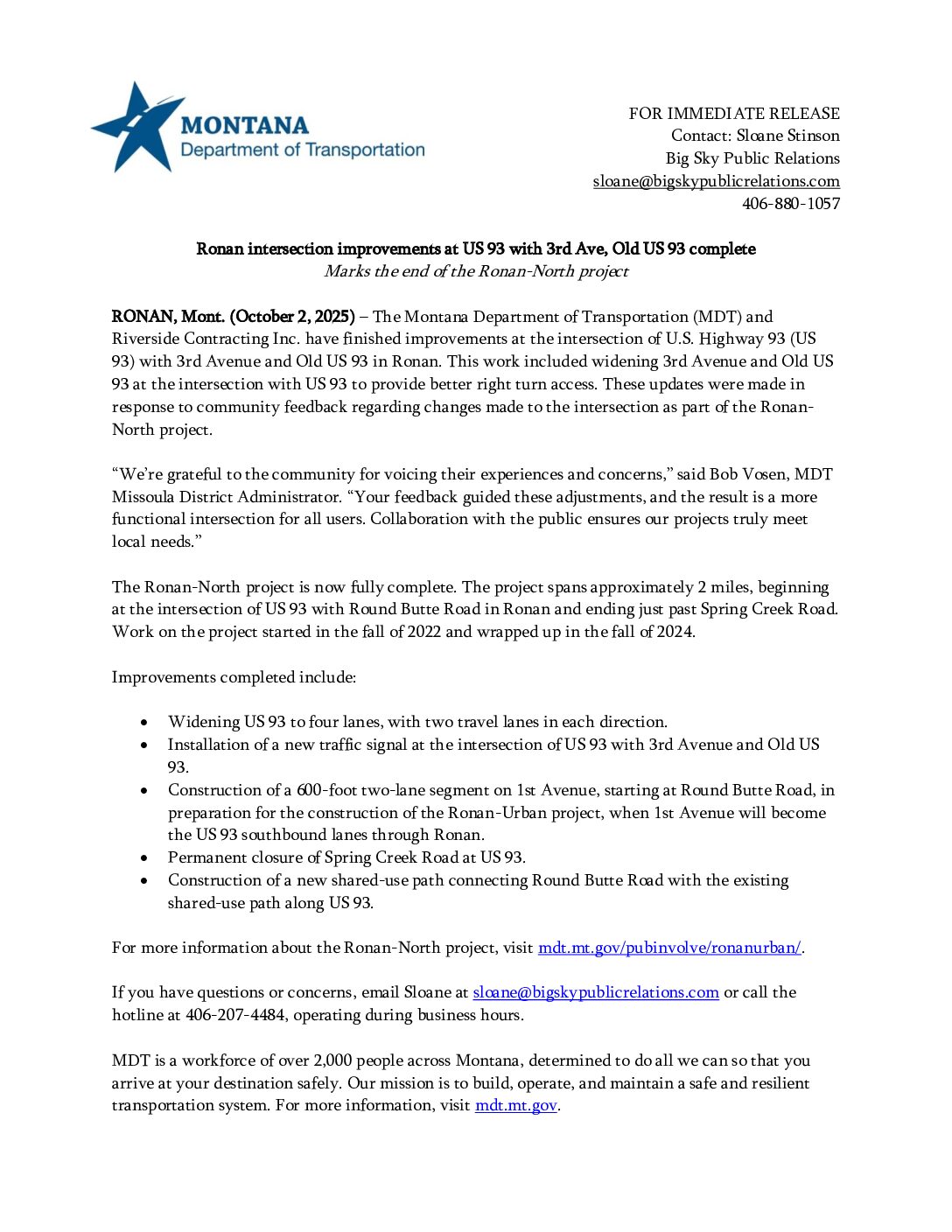 RONAN, Mont. (October 2, 2025) – The Montana Department of Transportation (MDT) and Riverside Contracting Inc. have finished improvements at the intersection of U.S. Highway 93 (US 93) with 3rd Avenue and Old US 93 in Ronan. This work included widening 3rd Avenue and Old US 93 at the intersection with US 93 to provide better right turn access. These updates were made in response to community feedback regarding changes made to the intersection as part of the Ronan-North project.